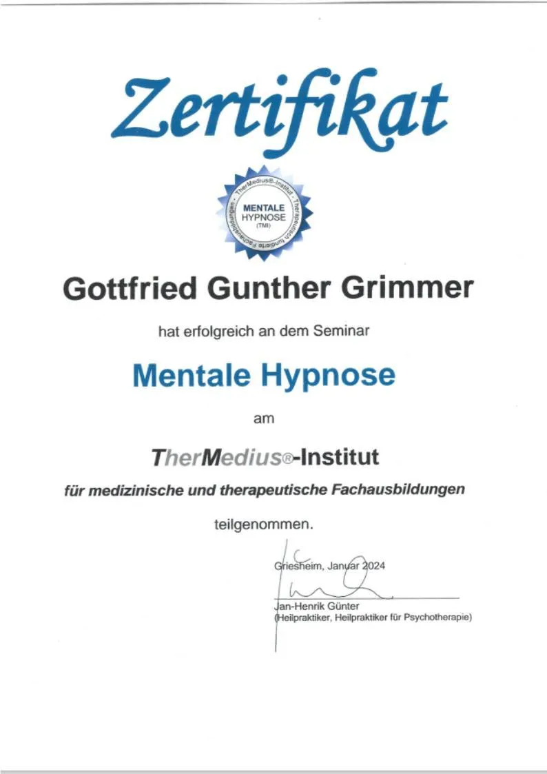 “Werter Herr Grimmer, 3x hatte ich die sehr positive Erfahrung einer energetischen Hypnose bei Ihnen . Sie waren sehr einfühlsam und halfen mir bei der Suche und Befreiung des inneren Kindes, der Stärkung meines Selbstbewusstseins i und der Bewältigung meines Liebeskummers. Dafür bedanke ich mich hiermit noch einmal und werde, falls ein neues Problem auftaucht, mich wieder vertrauensvoll an Sie wenden. Danke.”